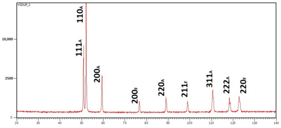 Figure 7 demonstrates the X-ray diffraction spectrum of the experimental steel (A—austenite and F—ferrite). Figure 8 shows TEM micrographs of the microstructures of the BM. The ferritic and austenitic grains are visible, and their grain boundaries and interiors are completely free from precipitates. The austenitic grains (Figure 8a) were almost completely free of lattice defects such as dislocations or twins. On the other hand, the ferritic grains in Figure 8b manifested a certain dislocation density. No precipitates were found in the material. One can thus summarize that the material state in Figure 8 corresponds well to near-equilibrium, which can be obtained by solution annealing, for instance. In other words, the TEM observations confirmed the results of the light microscopy examinations, as Figure 6 illustrates.