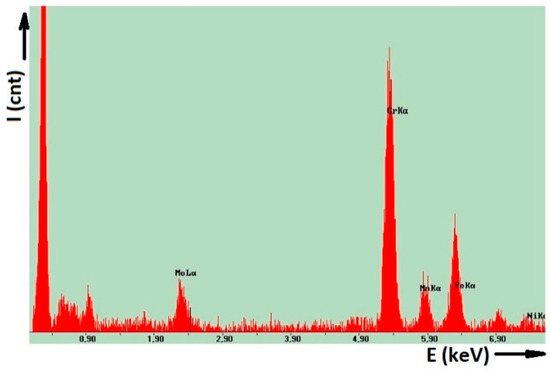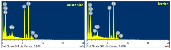 The characteristic EDS spectrum of austenite and ferrite is shown in Figure 9. Table 6 summarizes the results of the statistical measurement of the chemical composition of the austenitic and ferritic regions in the EDS weld metal. At least 20 measurements were taken from each characteristic area of the weld metal.