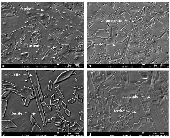 The main object of the SEM analysis was to determine the volume fraction of austenite in the WM. Table 5 summarizes the austenite volume fraction in the weld metal of differently welded specimens. The samples made using the oscillating movement of the laser head were the ones with acceptable values of the volume fraction of austenite, in the range of 40–50%. Through the use of the oscillating motion of the laser head, we can achieve a suitable volume fraction of austenite. We reached this in Samples C and D. The increased heat input followed by slower cooling of the weld metal was due to the positive effect on the ferrite transformation to austenite.