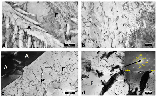 TEM micrographs showing details of the WM microstructure: (a) overview image of Sample A—austenite (A) at the ferritic grain boundary, (b) details of the ferritic (F) matrix—Sample A, (c) general view of the microstructure of Sample C—precipitates (P) inside the ferritic grain, (d) details of ferritic matrix with precipitates—Sample C.