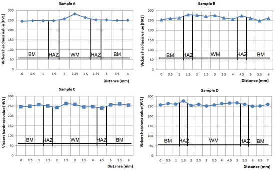 Hardness of weld joints in the longitudinal direction on the cross-section for (Samples (A–D)).