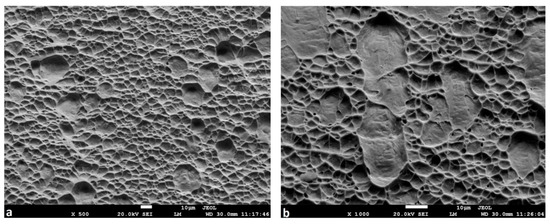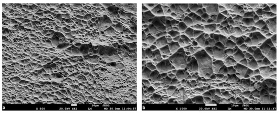 The SEM analysis of the fracture surface morphology showed the differences between the samples. In Figure 15 and Figure 16 are shown SEM fractographs of the surfaces of the tensile test fracture obtained at room temperature. Equiaxed dimples of a rather uniform size were observed, which is expected in ductile rupture; this is typical for ruptures in the base metal (Figure 15a). The higher magnification view shows small dimples within dimples of a moderate size and very tiny voids in the membrane separating the dimples of moderate size (Figure 15b). There are almost no inclusions. A very similar fracture surface morphology was observed in the case of Sample B.