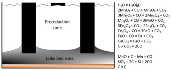 The furnace interior is typically divided into two reaction zones: the upper section, characterized by lower temperatures, is known as the prereduction zone, whereas the lower high-temperature region is referred to as the coke bed zone. An illustration of the furnace including the chemical reactions occurring as materials descend the furnace is shown in (Figure 1). As the raw materials descend in the prereduction zone, they will be heated through convection from the hot gases ascending from the coke bed zone, but also through conduction and radiation heat. Increasing temperatures lead to the initiation of exothermic gas–solid reactions that will reduce higher manganese oxides in the ores to MnO. Iron oxides, which are always present to some extent in the ore, will be reduced in a similar manner, where a complete reduction to metallic iron is possible. As manganese ores vary significantly in both chemical and physical characteristics, the process relations may vary significantly depending on which manganese materials are used for production. Some are oxides, others are carbonates, and they exhibit varying iron concentrations and moisture contents, as well as significant differences in strength and porosity. At sufficient depth in the furnace, the temperatures are high enough that the materials (except coke) form a slag phase. This high-temperature region on the lower parts of the furnace is referred to as the coke bed zone, and it consists of a solid coke bed, liquid slag, and liquid alloy. The liquid slag contains MnO and SiO2, in addition to Al2O3, CaO, and MgO. These oxides are usually present in the ores, and the concentration of the two latter is often increased by the addition of fluxes. MnO and some SiO2 will be reduced by carbon to a metallic state from the slag phase, which, together with iron and some dissolved carbon (typically 7% for high carbon ferromanganese), forms the tapped alloy.