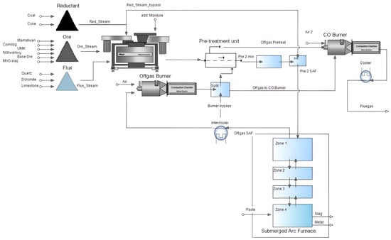 While simulation models are excellent for insights into operational efficiency and performance, a comprehensive understanding of the environmental impact of a system requires the use of life cycle assessments (LCA). LCA is a standardized method detailed in ISO standards such as ISO 14040:2006 [10] and ISO 14044:2006 [11], as well as in standards addressing specific applications like the carbon footprint of products (ISO 14067:2018) [12]. LCA may provide a holistic perspective on the environmental impact of metallurgical processes. Previous LCA studies on manganese ferroalloy production include work by Haque and Norgate [13], who estimated greenhouse gas emissions in Australia, and Westfall et al. [14], who presented cradle-to-grave potential environmental impacts and indicators for HC FeMn, SiMn, and a theoretical “average manganese alloy” using data from 16 mines and smelters. Conducting an LCA by collecting production data from ferroalloy producers provides real-world insights and an accurate representation of operational practices. However, this approach may be limited by data availability or variability in practices among different producers. In contrast, using a simulation model allows for greater flexibility and control in exploring various scenarios, thus enhancing the ability to assess hypothetical changes and new process developments. Simulation-based approaches for conducting life cycle assessments have gained increased attention in metallurgical industries over recent years [15,16,17,18]. This approach guarantees consistent comparisons across various scenarios and facilitates a precise definition of the production process. It also allows for the incorporation of empirical data into the evaluation, enhancing the accuracy and reliability of the assessments.