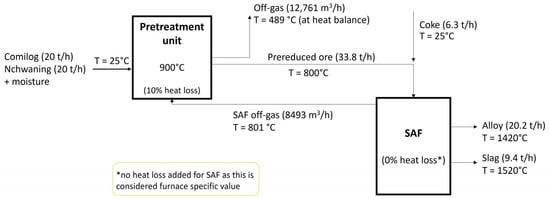 When operating a closed furnace, pretreatment that utilizes the off-gas from the submerged arc furnace can be installed. The gas can either be introduced directly to the pretreatment unit, where the CO will then function as a reductant, or the CO can be burned to CO2, releasing energy to use the off-gas purely as a heating medium. However, on the ton CO2 per alloy basis, prereduction is more advantageous than heating in inert atmospheres (like CO2), as it minimally affects the oxygen levels in the manganese ore. If used as a reductant, the CO will reduce the manganese ores in an exothermic manner, where the final reduction extent depends on the maximum temperature obtained, as well as the holding time. Due to the strong exothermic nature of the manganese ore reduction, it was found that feeding the off-gas directly from the submerged arc furnace to the pretreatment unit can, in this case, lead to a complete reduction of the higher manganese oxides in the ores to MnO. A temperature of 900 °C was achievable without any addition of external heat or energy due to the strong exothermic nature of the reduction reactions. An illustration of the flows in the evaluated system with pretreatment is shown in Figure 3. The manganese ores are fed to the pretreatment unit, where they meet the off-gas from the submerged arc furnace, reducing higher manganese oxides to MnO. The pretreated ore is mixed with the reductant before entering the submerged arc furnace. Table 4 shows the off-gas from the submerged arc furnace and the pretreatment unit when running the pretreatment unit on the off-gas from the submerged arc furnace at a temperature of 900 °C. Note that the introduction of a pretreatment unit to the process line will not affect the composition of the alloy and slag. When the higher manganese oxides are fully converted to MnO in the pretreatment unit, the off-gas from the submerged arc furnace will consequently be 100% CO. This is valid in the model due to the simplification of excluding volatiles and moisture from the composition of metallurgical coke. In reality, however, the reductants will contain a certain amount of moisture and other volatile substances that may exit with the off-gas if the reductant is fed directly to the submerged arc furnace.