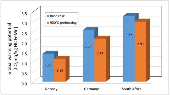 Global warming potential [kg CO2-eq] per kg HC FeMn produced from Comilog ore and Nchwaning ore in a closed furnace, with and without a pretreatment step, as presented in Section 3.1. The global warming potential is presented using emission factors of electricity for Norway, Germany, and South Africa, respectively.