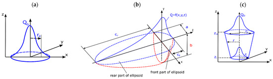 Scheme of standard: (a) model of a 2D Gaussian distribution, (b) double ellipsoid, and (c) 3D volumetric conical model heat source models used in numerical simulations of welding [18].