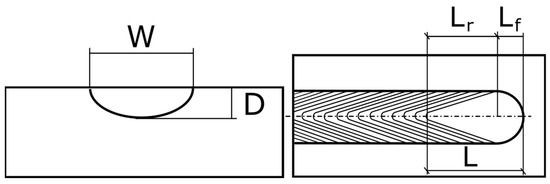 Scheme for measuring the size of beads geometry: W—bead width, D—bead penetration, L—molten metal pool length, Lr—length of the rear part, Lf—length of the front part of molten metal pool.