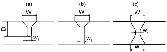 The double ellipsoid model is the most complex model in calibration, where obtaining the correct bead geometry often requires many iterations. However, even with a simpler model such as the three-dimensional, volumetric conical model, which is mainly used to simulate welding processes with high energy concentrations, such as laser beams, electron beams or plasma arcs, users often encounter a similar problem. The bead geometries obtained in welding tests, depending on the process parameters used and the achievement of full or partial penetration of the tested samples, have the following shapes: usually even, narrow or slightly widened in the upper part, Figure 3a,b. In the case of full penetration, these are usually beads with an elongated face in relation to the remaining width of the bead and little or non-existent widening in the root, as well as beads with a clearly wider area of the back with a visible narrowing of the bead’s width occurring in its central part, the so-called “hourglass” (Figure 3c). A brief analysis of the shapes possible to obtain with the use of a laser beam is sufficient to conclude that it also will be not always possible to reproduce them using a standard conical model, as shown in Figure 4 [3,6,18].