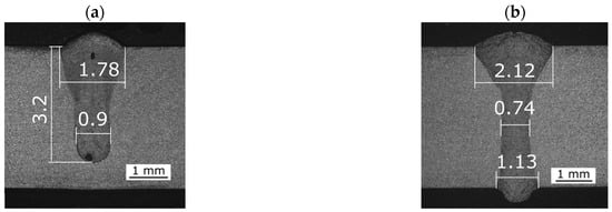 Correct representation of the molten metal pool geometry, and thus the determination of the parameters describing the mathematical heat source model, requires knowledge that can be obtained based on experimental tests based on measurements made on metallographic samples, as shown in Figure 2. During the calibration procedure, the parameters describing the created model must be defined in such a way that the result in the form of the calculated temperature distribution and the geometry of the molten metal pool corresponds to the geometry of the weld pool obtained in welding tests on real samples. While the surface model with the Gaussian distribution (Figure 1a) is a model usually used in simulations of surface treatment with, e.g., a laser beam, the definition of this model is relatively simple, and the volumetric models (Goldak’s model and the conical model—Figure 1b,c) require more attention [14,15,24].