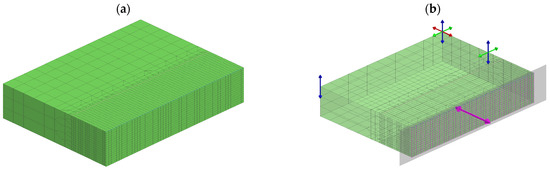 View of (a) 3D symmetric discrete model and (b) clamping boundary conditions of the model in the analyses of the disc laser ‘bead on plate’ welding process.