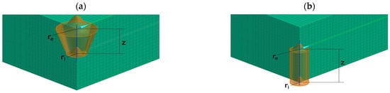 The third model, used mainly in the case of modelling welding heat sources with high energy density [8,18], is the volumetric, three-dimensional conical model (Figure 1c), which is described by the following equations [15]: