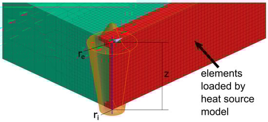 Numerical analyses of the disc laser ‘bead on plate’ welding process were carried out as a continuous analysis, using three variants of heat source models. The first of the models used was a predefined conical, volumetric model in the shape of a truncated cone (marked as CONE), as shown in Figure 1a. The geometric parameters of the conical model are defined by two radii in the upper (re) and lower (ri) parts of the model and its height (z). The amount of heat introduced is determined by the heat input and method thermal efficiency coefficient, as shown in Table 2.