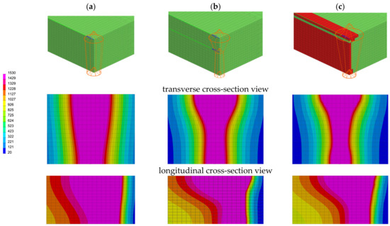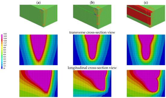Comparison of the calculated temperature distributions on the cross-section of the L2 sample bead with full penetration: (a) conical volumetric model (CONE), (b) combined model (COMB), and (c) model with defined area of mesh elements heated by heat source model (LOAD).