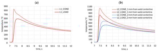 For the example of the bead with full penetration (L2 sample), the thermal cycles were determined at points located 1.0 and 2.0 mm away from the bead centreline. Differences between the standard and the modified models were visible, the difference in the maximum value of the heat cycle temperature calculated was 203 °C and 120 °C, respectively, at points 1.0 and 2.0 mm from the bead centreline, as shown in Figure 11b. The reason for this may be that analysis of the temperature distribution on the longitudinal section additionally showed that, in the standard model, the length of the root molten area is 60% longer than the others, as shown in Figure 9a. The results obtained in both cases by the combined model, consisting of two standard models, corresponded to the results obtained by using the model with the defined, loaded mesh elements, as shown in Figure 9b,c.