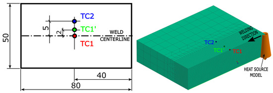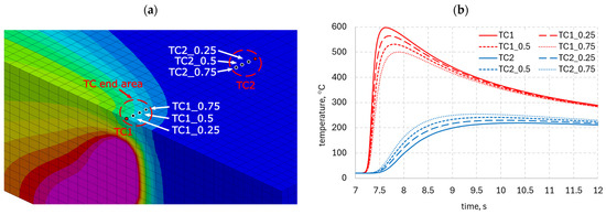 When modelling processes with high power density, the model mesh is usually highly dense in the area of influence of the heat source model to obtain a precise representation of temperature distributions. Thus, with the size of the mesh element in the model used equal to 0.25 mm, and the smallest tip of the thermocouple used in the tests (0.75 mm), as many as four mesh nodes can be accommodated, as shown in Figure 15a. The analysis of thermal cycles at these points showed that the difference in the maximum temperature in the case of nodes corresponding to the TC1 thermocouple (located in the bead centreline) reached the value of nearly 100 °C, and in the case of the TC2 thermocouple, it was about 35 °C, as shown in Figure 15b.