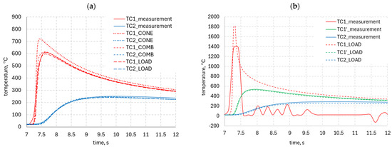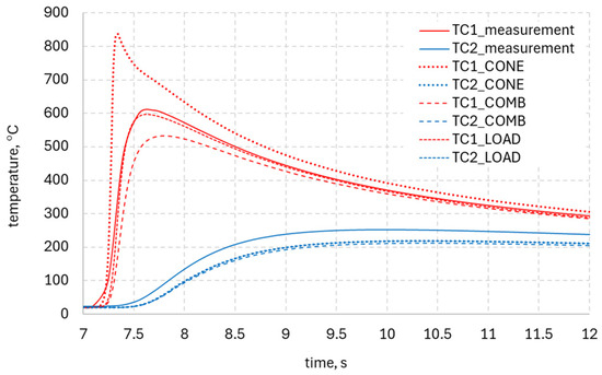 The calculated thermal cycles for the point corresponding to the thermocouples TC1′ and TC2 in the case of the model with the defined area of heated elements (LOAD) showed values similar to those recorded in the real process, both in terms of the obtained maximum temperature and the course of the analysed thermal cycles, as shown in Figure 16b.