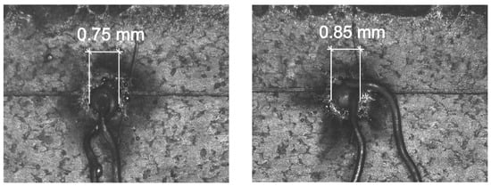 However, when analysing the calculated thermal cycles in more detail, it was noticed that there are also some differences in the maximum calculated temperature of the thermal cycle at the TC1 measurement for the case of using a model with a defined area of loaded mesh elements, as shown in Figure 13. This may be due to the fact that the thermal cycle is calculated at the mesh node of the model, while, in reality, the tip of the thermocouple is not a point but has a specific dimension that covers a larger area. The result is therefore recorded as an average of the temperature value in this area. Based on the analysis of selected measurement points, it was found that the size of the tip of the thermocouples heated to the tested samples was in the range of 0.76 to 0.84 mm, as shown in Figure 14.