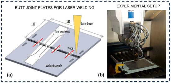 (a) Scheme of arrangement of butt joint plates for laser welding, (b) experimental setup of the laser equipment used in the experimental work.
