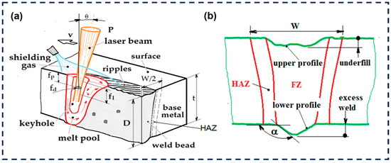 (a) Schematic representation of the weld bead during laser welding (b) and of weld bead geometry measurements.