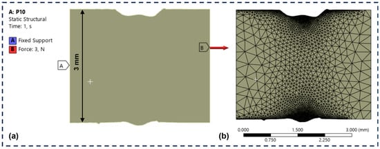 The experimentally obtained profile geometry was processed in CAD/CAE software (ANSYS Workbench 2024 R2) for 3D modeling and application of the finite element method (FEM) to determine how the weld profile affects stress concentration. A structural static analysis of the welding profiles was employed (Figure 3a). For the mesh configuration, an element size of 0.01 mm and the MultiZone Quad/Tri method was used (Figure 3b), which creates square and triangular elements, as well as contains an automatic optimization, allowing for greater precision in areas of higher stress concentration (smaller elements and a greater number of elements).