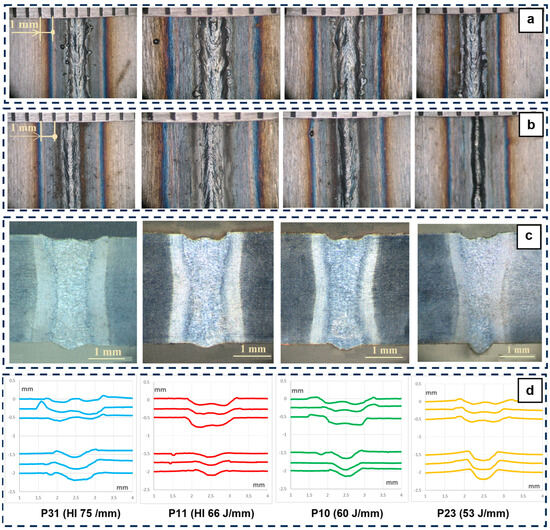 Appearance of the welding seams (top (a) and bottom (b)), cross-sections of the weld beads (c), and upper and lower profiles of the weld beads captured with a profilometer (d). From left to right, heat input (75, 66, 60, and 53 J/mm).