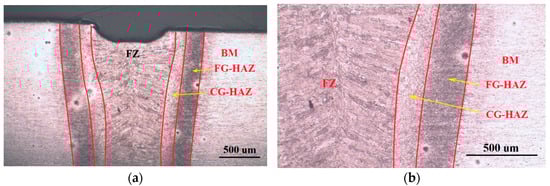 It is worth noting that the sizes of the HAZ and FZ of the laser processes are smaller than those of the conventional process [43]. HSLA laser welding offers significant advantages, particularly in precision industries, with minimal material distortion, and is highly effective for welding thin materials with minimal risk of burn-through.