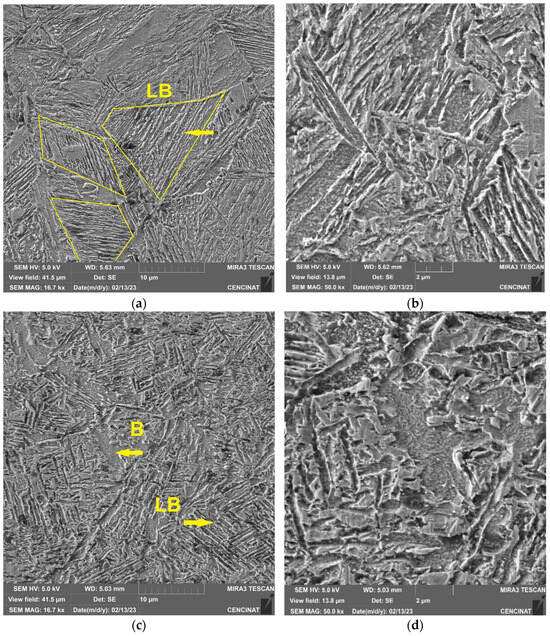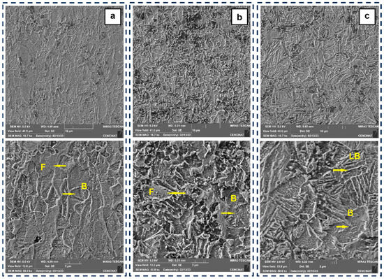 As can be seen in Figure 6a, showing the large and elongated grains of the ferrite (F) and bainite (B) products of the thermomechanical process applied in the formation of the base metal plate recrystallized into FG-HAZ and CG-HAZ, between these two zones, the difference in grain size was notorious. Small grains of ferrite and bainite were observed in the FG-HAZ, while in the CG-HAZ, there was a complex microstructure composed predominantly of bainite and lath-shaped bainite (LB). For lower heat inputs, small amounts of martensite may also appear [35].
