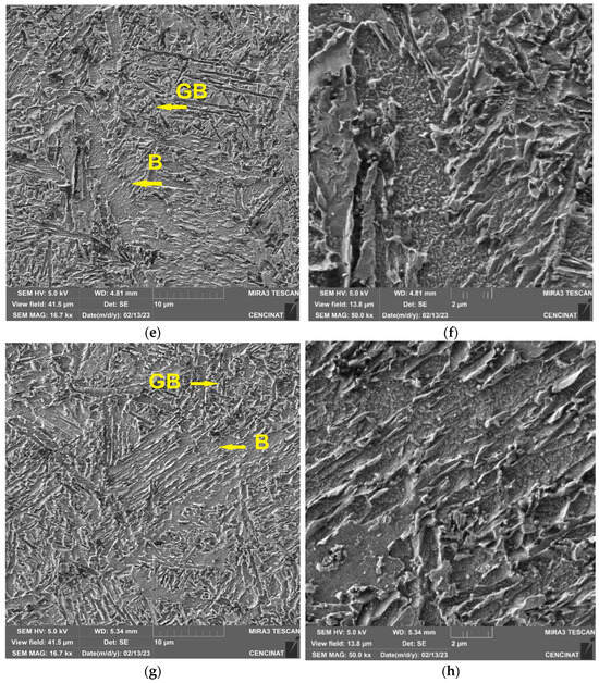 The FZ also presents an abrupt change in the microstructure, with columnar grains oriented in the direction of solidification much larger than those of the CG-HAZ, as can be seen in Figure 5a,b. The effect of heat input is much more noticeable in the FZ, as observed in the evolution suffered by the microstructure from the lowest heat input (53 J/mm) up to the highest heat input (75 J/mm) in the SEM micrographs of the samples, as shown in Figure 7a–h. Thus, a microstructure predominantly composed of many blocks of lath-shaped bainite progressively evolves to one composed of granular bainite (GB) and upper bainite (UB) [36]. In the samples with low heat input, martensite and retained austenite may also be present in small amounts. In several studies [18,37,38,39] on laser welding or thermomechanical simulation of the heat-affected zones with bainitic microstructures in the base metal, the formation of martensite, mixtures of martensite and bainite, bainite, and mixtures of bainite and ferrite has been reported, depending on the heat input, the thicknesses used, and the cooling rates that occurred.