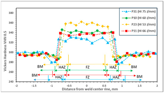 Figure 8 shows the microhardness Vickers’ profiles (HV, 0.5 Kg, 10 s) and the widths of HAZ and FZ produced in the four welded samples. There was a progressive variation in the hardness and the width of the FZ and HAZ when the HI varied from 75 to 53 J/mm. The hardness increased in the FZ and CG-HAZ; conversely, in the FG-HAZ, the samples suffered softening while the width of the HAZ and FZ decreased [35]. The described behavior is consistent with the results reported by Khan et al. [2]. Regarding the hardness of the BM, in the FG-HAZ zone, a maximum softening of −20 HV occurs for the sample with a thermal input of 75 J/mm, while in the FZ zone, a maximum hardening of +50 HV occurs for the sample with a thermal input of 53 J/mm.