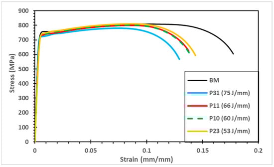 Table 4 shows the tensile mechanical properties of the four welded samples and the BM; meanwhile, Figure 9 presents representative stress–strain curves obtained through the tensile test according to the ASTM E8M standard. The results in Table 4 are the average of two specimens, and it should be noted that all welded specimens failed in the base metal.