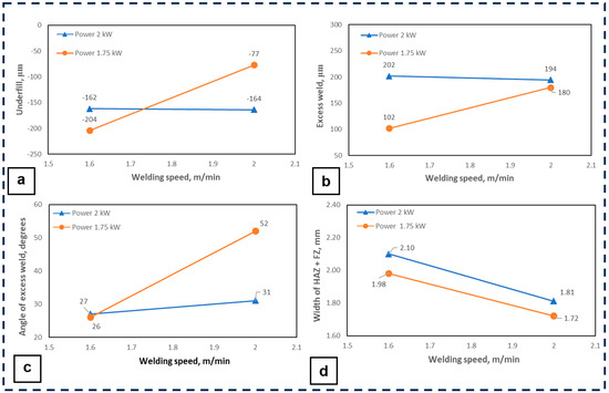 Figure 10 reveals that there is an interaction between laser power and welding speed on the imperfections: underfill, excess weld, and angle α, while, for the width W of the HAZ and FZ, it is evident that there is no interaction due to the parallelism of the lines observed in Figure 10d.