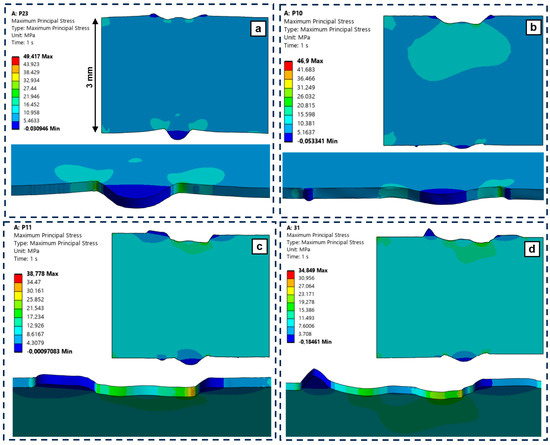 Maximum principal stress distribution on the weld profile models through the FEM. (a) Sample P23, (b) Sample P10, (c) Sample P11, (d) Sample P31.