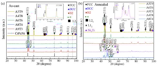 XRD patterns of as-cast and annealed alloys: (a) as-cast; (b) after annealing.