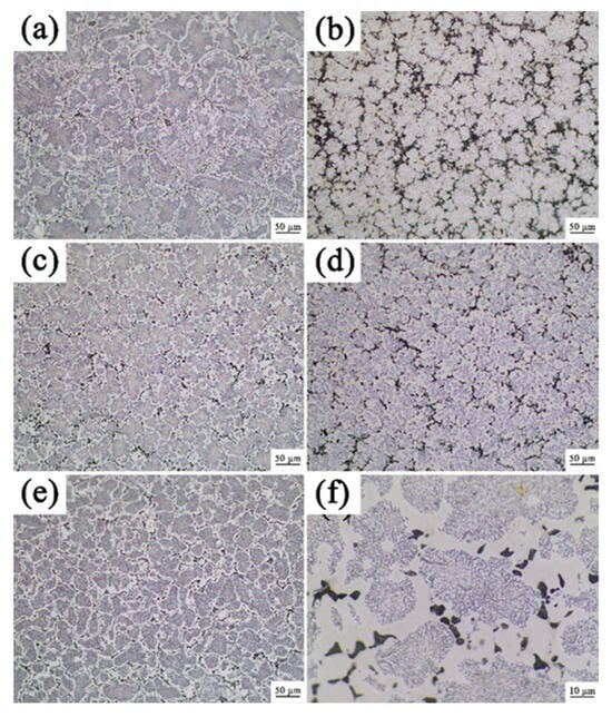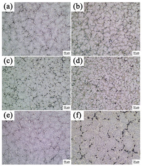 The OM images of the alloy after annealing at 800 °C: (a) A9T3; (b) A8T4; (c) A6T6; (d) A4T8; (e) A3T9; and (f) A6T6.