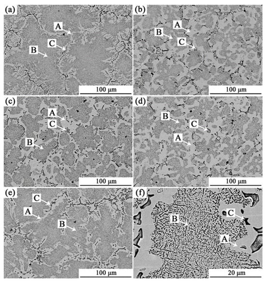 SEM-BSE image of the as-cast alloy: (a) A9T3; (b) A8T4; (c) A6T6; (d) A4T8; (e) A3T9; and (f) A6T6.