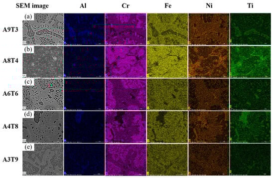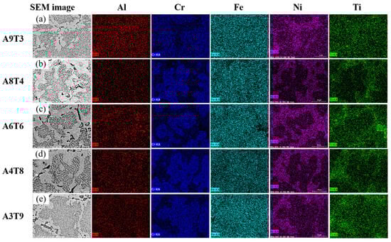 The SEM-BSE image of the alloy after annealing and corrosion treatment is presented in Figure 6. The phase composition rules remain consistent for A9T3, A6T6, and A3T9 alloys. The microstructure of the annealed samples shows no significant changes compared to the two-phase interwoven network structure observed in the as-cast state, except for the precipitation of new phases from dendritic and interdendritic regions. Similar to Figure 4, these phases are labeled as “A phase” (interdendritic structure) and “B phase” (dendritic structure). Additionally, a black elongated precipitated phase referred to as the “C phase” is found primarily within the A phase between dendrites. Figure 6f provides a locally enlarged view of Figure 6c, demonstrating that the C phase is mainly distributed within the A phase region. In the B phase, round rod-shaped light-colored phases were observed which are consistent with the color of A phase regions. Compared to as-cast alloys, previously nanoscale particles in the B phase exhibit growth phenomenon with an increase in size from a few hundred nanometers to a few micrometers. Similarly, microstructural and morphological changes in A8T4 and A4T8 alloys follow this regularity by presenting similar patterns where they become disordered while still retaining their dendrite structures observed in the as-cast state. To gain a deeper understanding of the distribution of elements within the alloy following annealing heat treatment, a mapping scan was performed, and the results are presented in Figure 7. The microstructural morphologies of A9T3, A6T6, and A3T9 alloys are notably different from those of A8T4 and A4T8 alloys, and these distinctions are discussed in this section. In the A9T3, A6T6, and A3T9 alloys, the segregation patterns of elements Al, Ti, Cr, Fe, and Ni are characterized by an interdendritic region enriched in Fe and Ni, a dendritic region with elevated concentrations of Cr and Fe, and a black elongated phase within the interdendritic region that is notably rich in Al, Ti, and Ni. Additionally, the black strip phase contains a white granular phase that is particularly enriched in Cr and Fe. In contrast, the A8T4 and A4T8 alloys exhibit distinct elemental distributions: the interdendritic regions are predominantly composed of Ni, Fe, and Cr, the dendritic regions show higher concentrations of Cr and Fe, the lamellar regions are enriched with Ni and Ti, the black striped C phase is significantly enriched with Al, Ni, and Ti, and the granular phase within the interdendritic regions also contains elevated levels of Al, Ni, and Ti.