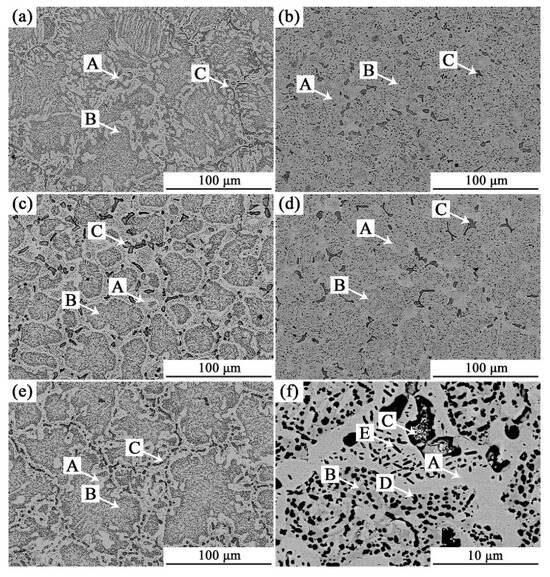 SEM-BSE image of the alloy after annealing: (a) A9T3; (b) A8T4; (c) A6T6; (d) A4T8; (e) A3T9; and (f) A6T6.