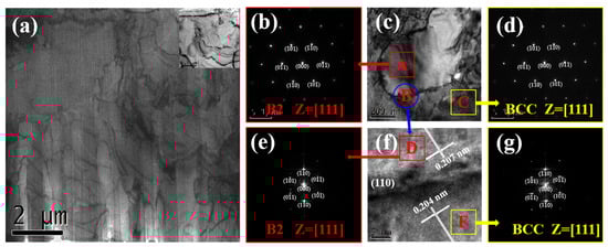 Due to the similar microstructure of A9T3, A6T6, and A3T9 alloys before and after annealing treatment, the A6T6 alloy was selected as the target for study after annealing. To further investigate the nanoscale morphology and structure of dendrites and interdendritic regions, transmission electron microscopy (TEM) analysis was conducted. Figure 8a presents a bright-field TEM image of the annealed A6T6 alloy. Figure 8c displays a bright-field image showing precipitates in the dendritic structure. Figure 8b,d exhibit diffraction patterns along the [111] crystal band axis in regions A and C of Figure 8c, respectively. Figure 8f illustrates a high-resolution TEM image depicting the interface area between the precipitate phase and the dendrite phase. Figure 8e,g demonstrate diffraction patterns along the [111] crystal band axis in regions D and F of Figure 8f, respectively. As illustrated in the figure, a significant amount of precipitation particles, rich in Ni, Ti, and Al, are dispersed across the dendritic structure, displaying a size distribution that spans from a few hundred nanometers to several micrometers. Upon examination with high-resolution transmission electron microscopy (HRTEM) and selected area electron diffraction (SAED), it has been established that regions C and F correspond to diffraction patterns along the [111] crystallographic axis of the body-centered cubic (BCC) phase, featuring an interplanar spacing of roughly 0.204 nm for the (110) crystal plane. Conversely, regions A and D reveal diffraction patterns along the [111] crystallographic axis of the B2 phase, with an interplanar spacing of approximately 0.207 nm for the (110) crystal plane. By contrasting these findings with the standard PDF card diffraction peaks for the (110) crystal plane depicted in Figure 1b [34], it is inferred that region B represents a face-centered cubic (FCC) phase, whereas region C signifies an L12 structured solid solution phase. Additionally, there is a notable interfacial coherence between the FCC phase and the L12 structured solid solution phase.
