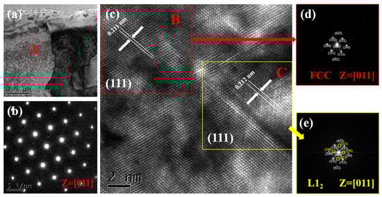 Figure 9 presents the TEM image of the interdendritic structure of the A6T6 alloy post-annealing. Specifically, Figure 9b depicts the diffraction patterns along the [011] crystal band axis in region A of Figure 9a. Figure 9c illustrates the high-resolution TEM image of region A from Figure 9a, where the triangular area in the lower right corner of Figure 9c is subjected to diffraction analysis on both sides. Figure 9d,e displays the diffraction patterns along the [011] crystal band axis in regions B and C, respectively, of Figure 9c. In Figure 9b, the diffraction patterns along the [011] crystal band axis reveal weak superlattice diffraction spots. Upon examining the high-resolution TEM image in Figure 9c, the triangular area in the lower right corner is analyzed, and diffraction analysis is conducted on both sides of this area. In Figure 9d, which shows the diffraction patterns along the [011] crystal band axis in region B of Figure 9c, the absence of superlattice diffraction spots is noted, and the interplanar spacing of the (111) crystal face is approximately 0.211 nm. Conversely, Figure 9e illustrates that in the C region of Figure 9c, superlattice diffraction spots are distinctly visible, with the interplanar spacing of the (111) crystal face being approximately 0.212 nm. By comparing these results with the standard PDF card diffraction peak for the (110) crystal plane in Figure 1b [34], it is determined that the corresponding phase in region B is the FCC phase, and the phase in region C is the L12 structured solid solution phase. Notably, the FCC phase demonstrates good interfacial coherence with the L12 structured solid solution phase, indicating a stable microstructure.