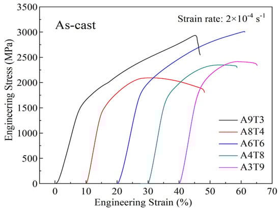 The engineering stress-strain curve of the sample is presented in Figure 10, with a test strain rate of 2 × 10−4 s−1. Table 5 provides the compressive property test results of as-cast alloys, including yield strength (σ0.2), fracture strength (σb), and degree of plastic strain (εp). As observed from the figure, the strain axes of the sample exhibit a stacking phenomenon. The data in Table 5 indicate that A8T4 alloy has a lower σ0.2 compared to A9T3 alloy, decreasing from 1435.93 MPa to 1338.13 MPa; likewise, its fracture strength decreases from 2934.41 MPa to 2093.71 MPa and plastic strain decreases from 36.4% to 32.4%. The highest σ0.2 value is achieved by the A6T6 sample at 1707.41 MPa, accompanied by σb and plastic strain values of 3010.29 MPa and 32.8%, respectively. As titanium content increases, the plastic strain of alloys continues to decrease. Compared to A9T3 alloy, the A3T9 alloy exhibits superior strength but poorer plasticity with a minimum plastic strain value of 17.6%.