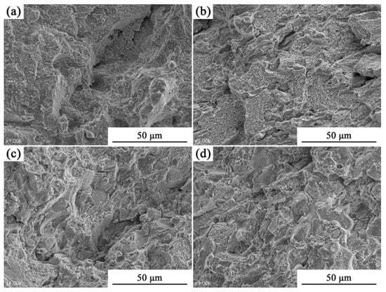 The fracture morphology of a cast alloy was examined using scanning electron microscopy in secondary electron mode following compressive mechanical properties testing to analyze the fracture mechanisms of the alloy specimens. Figure 11 illustrates the microscopic morphology of the fracture surface of an as-cast alloy sample. The A9T3 alloy exhibited excellent plasticity, as demonstrated by its intact and bonded state after compression testing. Consequently, we scrutinized the fracture surfaces of other samples. Figure 11a,b reveals a distinct dimple morphology characterized by numerous concave or convex micro pits on the fracture surface, within which second-phase particles are visible. Furthermore, a flat and shiny cleavage fracture morphology was also observed with numerous tearing edges interspersed with dimples, indicative of a typical quasi-cleavage fracture pattern. In Figure 11c, fewer dimples and a more pronounced cleavage morphology can be seen. Figure 11d primarily shows a cleavage morphology with fewer dimples but more visible tearing edges and discernible layer structure in the cleaved layers. The A3T9 alloy also exhibits quasi-cleavage fractures but demonstrates the highest tendency towards brittleness among all samples tested. From Figure 11a–d, it is evident that increasing titanium content progressively diminishes the plasticity of these alloys while shifting their fracture behavior from ductile to brittle.