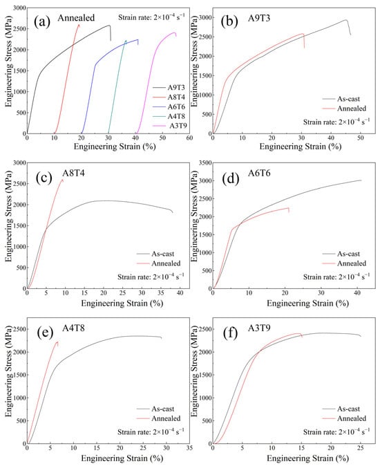 Compressive engineering stress–strain curves of alloys after annealing at room temperature (a); (b–f) comparison between as-cast and annealed states.