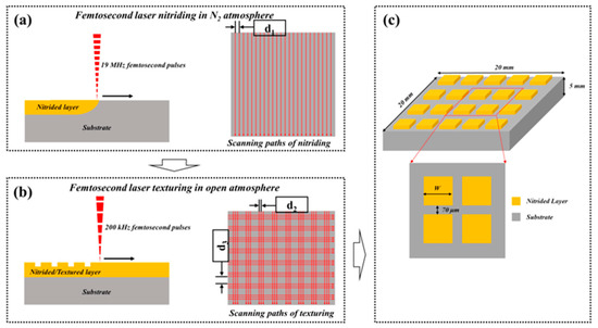 The TC4 alloy was modified using a combined nitriding and texturing approach with a femtosecond laser system. This system is characterized by an adjustable repetition rate ranging from 50 kHz to 19 MHz and a pulse duration of 270 fs. Detailed specifications of the laser system can be referenced in our previous research [13,22]. The schematic of the laser modification process is illustrated in Figure 1. In the initial step, femtosecond laser nitriding (FLN) was carried out at a repetition rate of 19 MHz. This process involved melting the surface of the titanium alloy in a nitrogen atmosphere, leading to the formation of a hard nitrided layer through the interaction between molten titanium and nitrogen. The laser scanning paths were parallel. To mitigate crack formation and ensure a uniform nitrided layer, the FLN parameters were optimized as follows: single pulse energy of 1.74 μJ (well below the ablation threshold of titanium), scanning speed of 40 mm/s, scan spacing of 20 μm, and nitrogen flow rate of 20 L/min. In a subsequent step, femtosecond laser texturing (FLT) was performed at a repetition rate of 200 kHz to ablate the nitrided layer, thereby creating a micron-scale square array structure. This FLT process was conducted in air, eliminating the need for a protective chamber. The scanning path for FLT is shown in Figure 1b. The texturing parameters were a single pulse energy of 20 μJ and scanning speed of 200 mm/s. A summary of the laser and scanning parameters for each step is provided in Table 2.