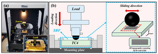 The tribological performance of the femtosecond laser treated samples was evaluated using a ball-on-disc tribometer (MFT-5000, Rtec, Silicon Valley, CA, USA), as illustrated in Figure 2. All tests were conducted at room temperature with the samples fully immersed in simulated body fluid (SBF) [24]. A Si₃N₄ ball, with diameter of 5 mm and hardness of 1500 HV, was used as the counterbody. The tests were conducted for 30 min with a motion length of 5 mm and a frequency of 10 Hz, corresponding to a sliding speed of 100 mm/s and a total sliding distance of 180 m. A normal load of 5 N was applied, resulting in a Hertzian contact pressure of approximately 1.7 GPa. Mass loss before and after the friction tests was measured using a digital balance with 0.01 mg precision, and each measurement was repeated three times for accuracy. Wear volume loss (V) was calculated from the wear scars using the formula: V = L × S, where L is the motion length (5 mm) and S is the cross-sectional area of the wear tracks [23]. The specific wear rate K was then determined using K = V/(F × D), where F represents the load (5 N) and D is the total sliding distance (180 m). The drafting of this manuscript was supported by GPT-4, a language model from OpenAI, used solely for language refinement. This tool contributed to the enhancement of textual expression and organization without affecting the analysis or interpretation of the research data.