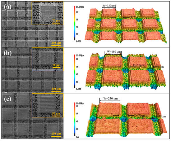 The geometrical characteristics of the FLN-FLT modified coating is illustrated in Figure 1c, where the height of the squared textures was fixed at 35 μm, and the spacing between adjacent texture was 70 μm. The density of the textures was adjusted by varying the width of the squares W. The texture density D can be calculated by D = (n × s/A) × 100%, where n is the total number of squared textures on the surface, s is the area of a single squared texture, and A is the total surface area of the sample [23]. Table 3 summarizes the square width W and the corresponding texture densities. For convenience, samples with texture densities of 55%, 65%, and 75% are referred as T1, T2, and T3, respectively. The untreated and single FLN-treated sample are referred to as A0 and N0, respectively.