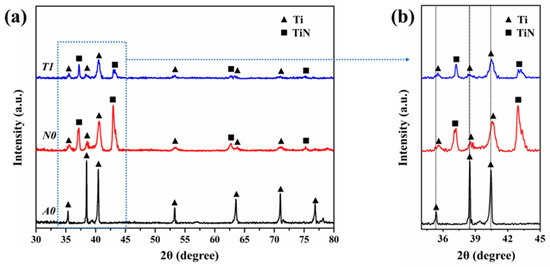 The XRD diffraction patterns are presented in Figure 5. The XRD results showed that the composition of the FLN-treated and FLN-FLT-treated surfaces were TiN and α’-Ti. The TiN phase displayed four main diffraction peaks at 2θ angles of 36.861°, 42.823°, 62.165°, and 78.441° (PDF card No. 38-1420), while the α’-Ti phase exhibited peaks at 35.170°, 38.455°, 40.751°, 52.092°, 63.106°, and 70.767° (PDF card No. 44-1294). As shown in Figure 5b, compared to sample A0, the diffraction peaks of Ti in sample N0 and T1 shifted slightly to the higher 2θ value. This was due to the effect of the nitrogen solid solution and residual tensile stress in rapid cooling during femtosecond laser nitriding. Furthermore, the TiN intensity in T1 was lower than in the N0 sample, which was caused by the material removal of the nitrided layer after femtosecond laser ablation.