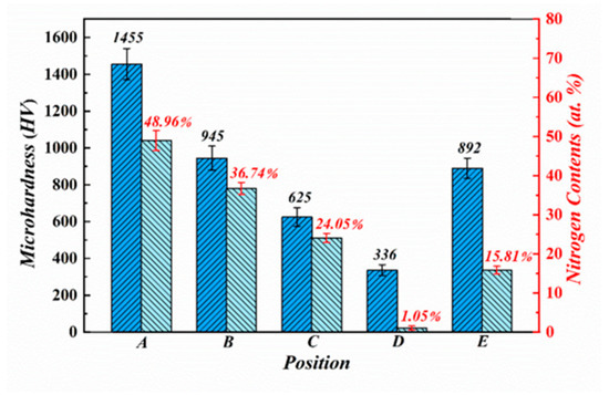 Figure 8 presents the hardness and nitrogen content distributions of different regions inside the nitrided layer. The nitrogen content at different positions along the depth was measured using EDS. The hardness of the near-surface region of the nitrided layer was 1455 HV, approximately four times that of the substrate (336 HV). The hardness of the nitrided layer decreased with increasing depth, and the values of the middle and interphase regions were 945 HV and 625 HV, respectively. The nitrogen content distribution was consistent with the hardness along the depth. In the dendrite arms (Point A), the nitrogen atomic content was close to 50%, indicating that nitrides were primarily in the TiN phase. In contrast, the nitrogen content of the nitrides in the middle and bottom regions (Point B and C) decreased to 36% and 24%, indicating that the nitrides were in the form of non-stoichiometric TiNx (x<1). Although the nitrides in both the outer (Point A) and middle (Point B) regions appeared as dendrites and shared the same crystal structure (FCC-TiNx (x<1)), their hardness was closely linked to the nitrogen content. As the nitrogen content decreased, the hardness of the nitrides also decreased. Additionally, the nitrogen atomic content of α’-Ti (Point E) reached 15% due to the nitrogen diffusion into α’-Ti. Hence, the hardness of nitrogen-rich α’-Ti increased to 892 HV under the effect of solid solution hardening and phase transformation [31]. It is noteworthy that laser nitriding can improve both the surface hardness and wear resistance of biomedical titanium alloys. However, this will lead to a moderate increase in the elastic modulus of the alloy. The increase in modulus may contribute to the stress shielding effect, which may ultimately result in bone resorption and the loosening of implants.