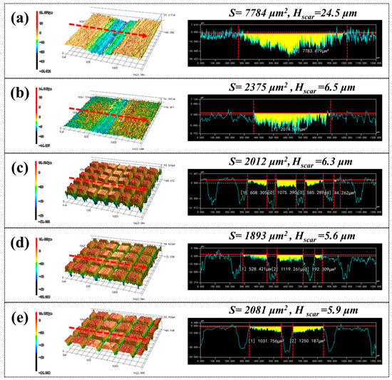 Figure 9 illustrates the 3D morphology and profiles of wear tracks after friction testing. The cross-sectional wear area (S) and wear depth (Hscar) were measured by CLSM software. For the untreated and FLN-treated samples with continuous wear tracks, S was measured directly. While, the wear track profiles of the FLN-FLT-treated samples were discrete, S was calculated by summing the wear areas at the textured sites, as shown in Figure 9c–d. The untreated sample had an S of 7784 μm2 and an Hscar of 24.5 μm, while the FLN-treated sample showed an improved wear resistance with an S of 2375 μm2 and an Hscar of 6.5 μm. Unlike the severe destruction reported in single femtosecond laser texturing [15], the textures of the FLN-FLT-modified samples only sustained partial damage, suggesting that nitriding significantly enhances the material’s mechanical properties. Therefore, the lifespan of textures is extended. Compared to the FLN-treated sample, the S and Hscar of the FLN-FLT-modified samples were further reduced, with optimal performance in the T2 (65% texture density), where S and Hscar decreased to 1893 μm2 and 5.6 μm, respectively.