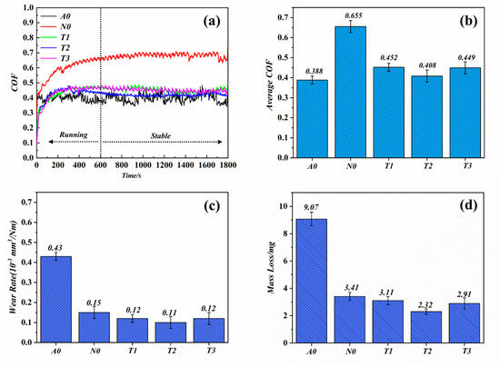 (a) The COF curves, (b) average COF, (c) wear rate, and (d) mass loss.
